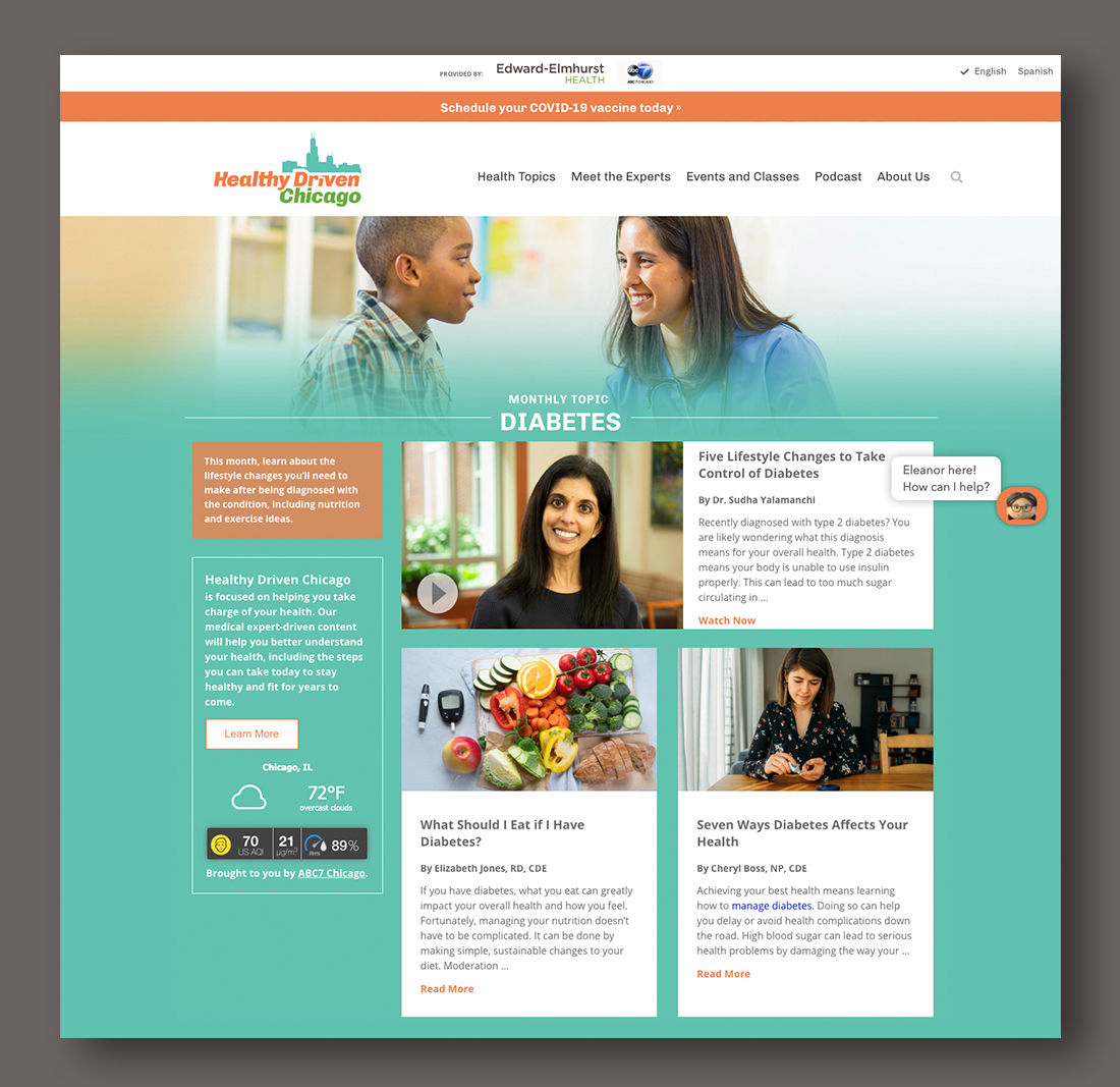 Working with clients Edward-Elmhurst Health (EEH) and ABC7 WLS-TV, ZG customized our proprietary CONVERGE platform to create Healthy Driven Chicago – a fully integrated, multichannel health education campaign that positions the hospital system, its physicians and ABC7 as the most reliable, trustworthy resources for quality healthcare information. Using the health system’s physicians as topic experts, we built an online community that features relevant health information and connects people with EEH physicians.